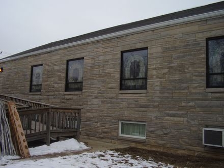 In 2011, Laws Stained Glass Studios installed (8) opalescent glass windows at Amity Baptist Church in Amity, Indiana. Each window (size 53" wide x 63" high) contains a 18" x 26" hand-stained medallion with a scene from the "Life of Christ" series and a memorial plate at the bottom.