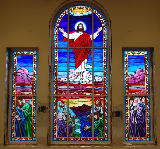 Laws Stained Glass Studios removed this existing window and frame. Laws installed a new white aluminum frame with a 1" tempered insulated glass unit on the outside as protective covering. The following is the resulting window (note that the interior plastering and woodwork was not completed when the picture was taken.)