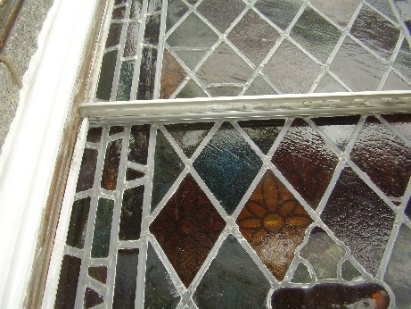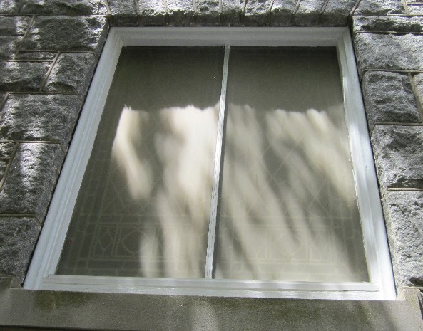 In August 2014, Laws Stained Glass Studios installed new protective covering at Cape Charles Presbyterian School in Cape Charles, VA. Laws began by removing the existing Lexan protective covering. The Lexan had protected the windows but it had turned yellow or milky white after a few years. Laws repainted the outside wood frame and made any necessary repairs to the wood. Laws installed new 1/4" Lucite as the protective covering. Lucite is an acrylic that stays clear and does not turn yellow or milky white.