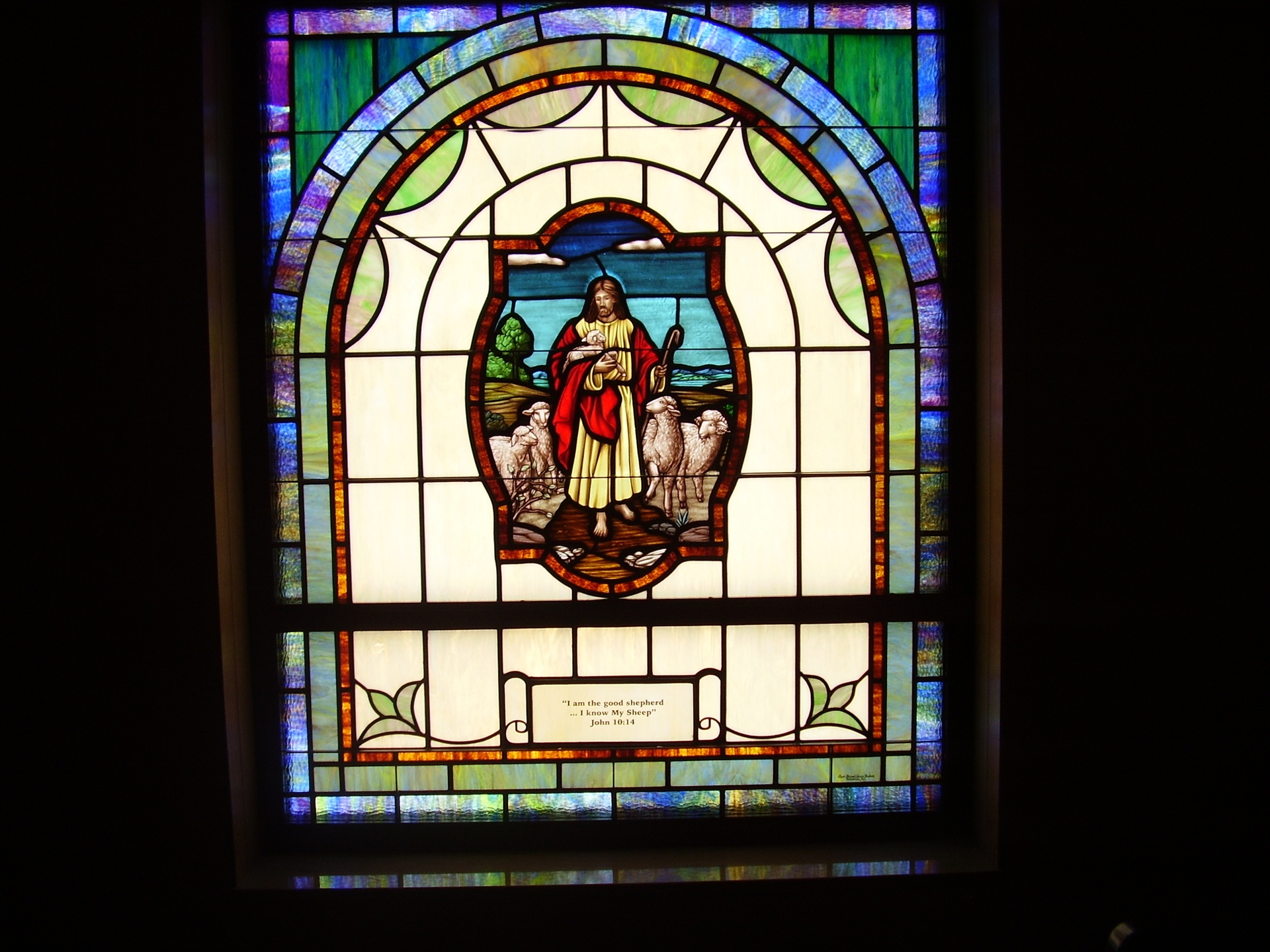 Check out the opalescent glass windows with Biblical scene medallions at Amity Baptist Church in Amity, IN!