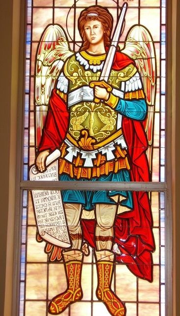 Close-up of the hand-stained glass floating figure of "St. Michael"