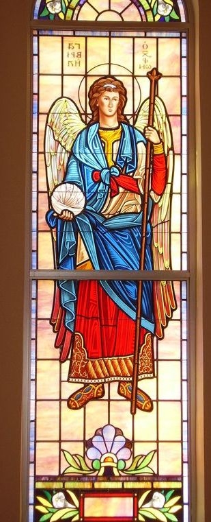 Opalescent glass window with floating figure of "St. Gabriel"