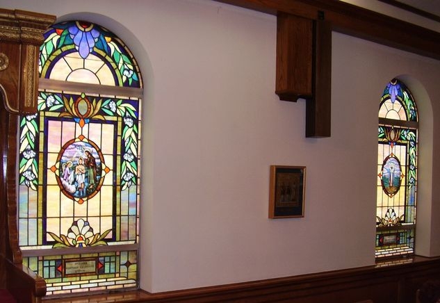 Existing hand-stained glass window on the left and existing opalescent glass window on the right