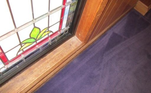 Laws removed the existing metal frames with Krinkle glass. Laws provided new dark bronze aluminum frames. On the interior, the new leaded windows were installed into the new frames. On the outside, Laws installed 1/4" Lucite as the protective covering.