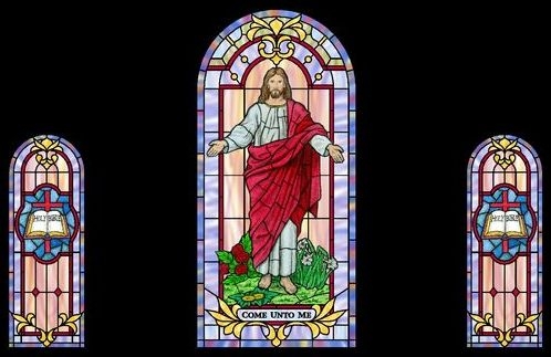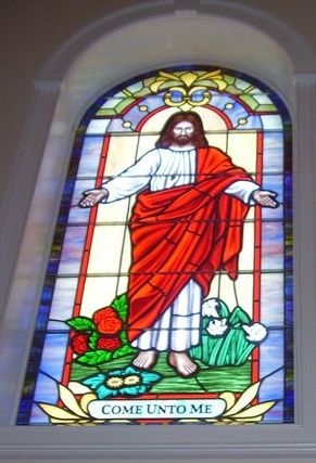 Opalescent glass window with a hand-stained glass floating figure of Christ "Come Unto Me"