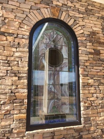 Laws first installed the dark bronze aluminum frames into the stud openings. The church covered the frames with plastic in order to protect them while the masons laid the brick and stone. The frames were used as templates for the masons. Later, Laws returned and installed the leaded glass windows into the frames on the interior. On the exterior, Laws installed 1" insulated glass units into the frames.