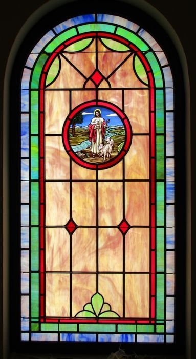 Opalescent glass window with a 12" round scene of "The Good Shepherd" set into a dark bronze aluminum frame