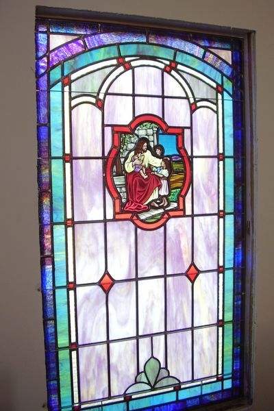 Opalescent glass window with 12" x 16" medallion with a scene from the "Life of Christ" series