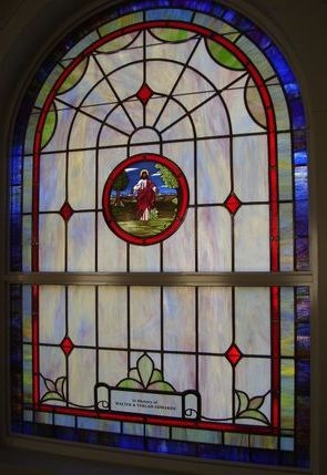 Opalescent glass window with 12" round biblical scene and a memorial plate set into a new white aluminum frame