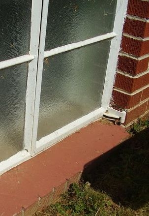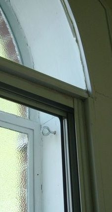 Close-up of the existing steel frame window from the outside before the installation of new leaded windows on the inside