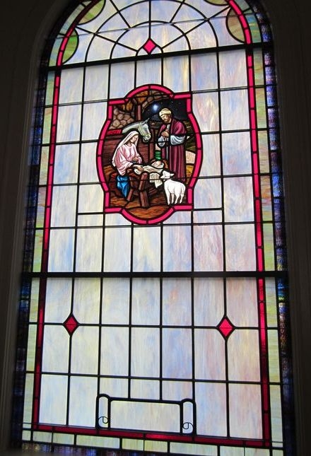 Opalescent glass window with a 18" x 26" hand-stained glass medallion with scene "Nativity" and a place for a memorial plate