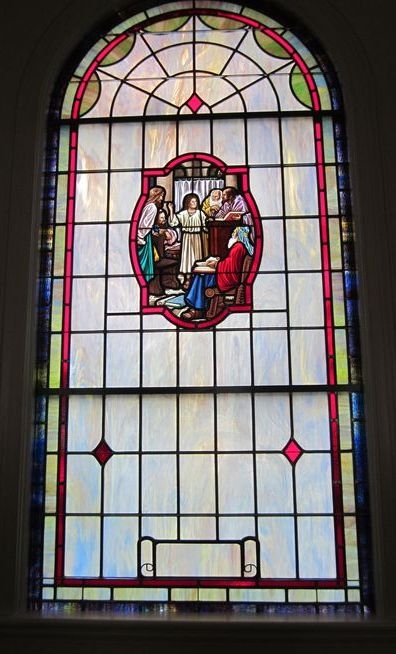 Opalescent glass window with a 18" x 26" hand-stained glass medallion with scene "Boy in the Temple" and a place for a memorial plate at the bottom