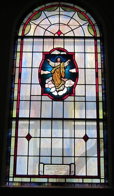 Opalescent glass window with a 18" x 26" hand-stained glass medallion with scene "Ascension" and a memorial plate