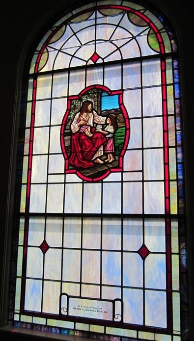 Opalescent glass window with a 18" x 26" hand-stained glass medallion with scene "Blessing the Little Children" and a memorial plate