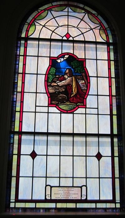 Opalescent glass window with a 18" x 26" hand-stained glass medallion with scene "Garden of Gethsemane" and a memorial plate