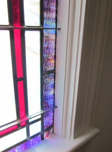 Opalescent glass window installed into the wood frame with the outside wood covered with white aluminum flashing; also on the exterior is 1/4" Lucite acrylic as the protective covering