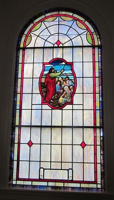 Opalescent glass window with a 18" x 26" hand-stained glass medallion with scene "Sermon on the Mount" and the place for a memorial plate at the bottom