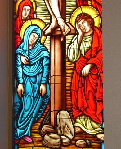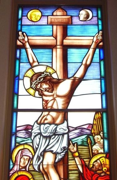 Hand-stained pictorial glass window of "The Crucifixion" set into the existing aluminum frame.