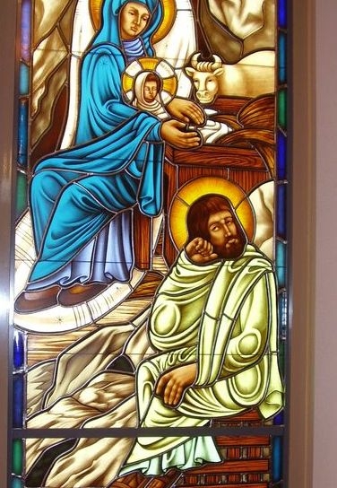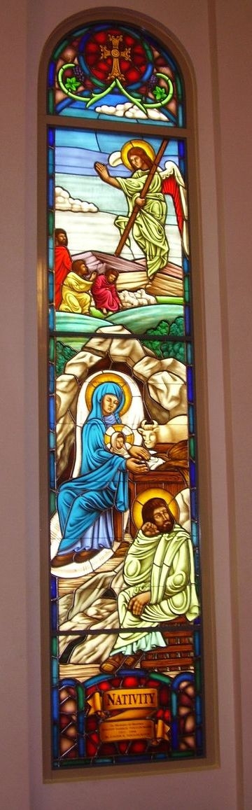 Hand-stained pictorial glass window depicting "The Nativity". This window does not receive natural light. The window is set into the existing frame and artificially backlit by the church.