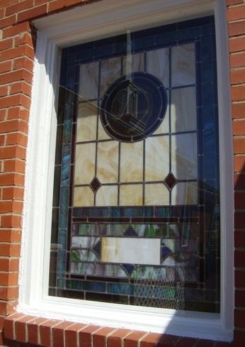 Opalescent glass window with 12" round symbol and a memorial plate