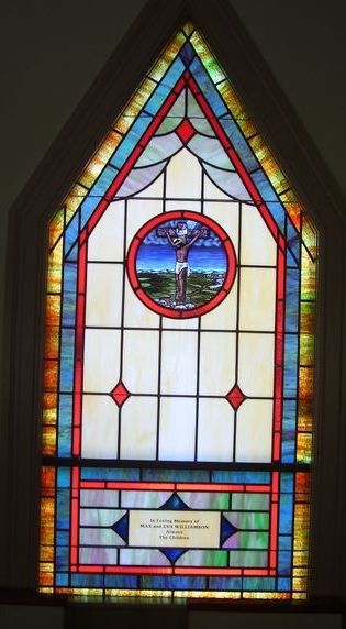 One of the smaller opalescent glass windows with a 12" round symbol and a memorial plate