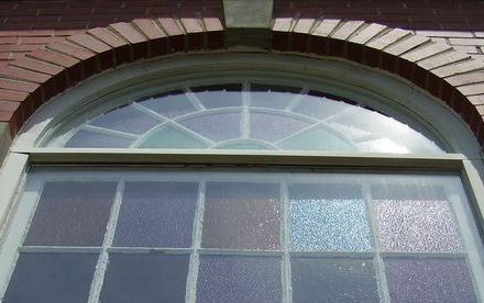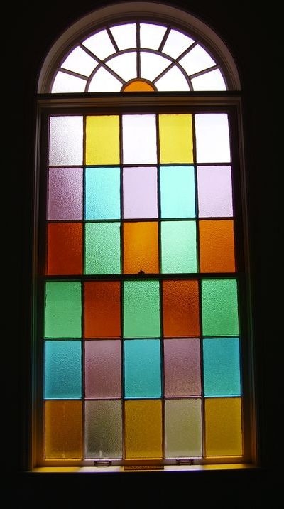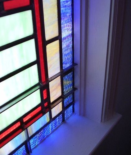 View of the opalescent glass window set into the existing wood frame with existing 1/4" plate glass on the outside as the protective covering