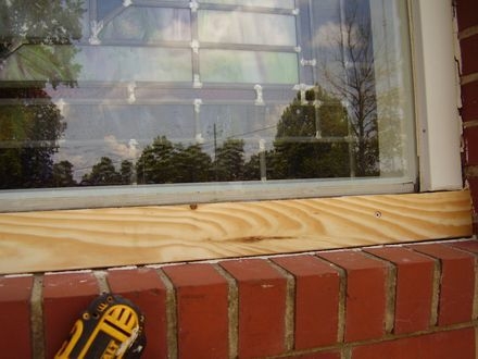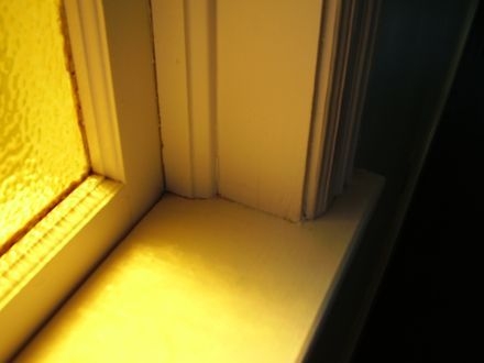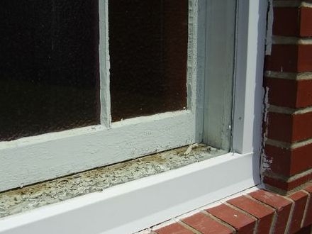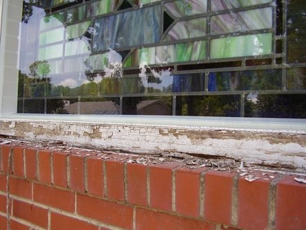 Laws replaced these window sills with new wood while leaving the existing plate glass in place.