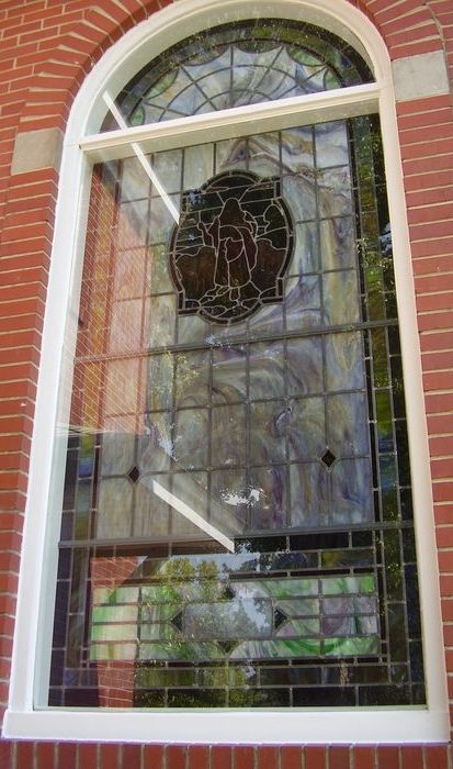 Opalescent glass windows with 18" x 26" hand-stained glass medallions and a memorial plate