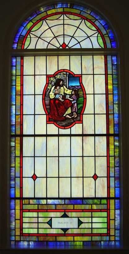 Opalescent glass window with 18" x 26" hand-stained glass medallion of "Blessing the Little Children" and a scripture plate