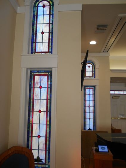 In 2017, Laws returned to install (4) more opalescent glass windows (size 34" wide x 64" high). These were installed into existing frames.