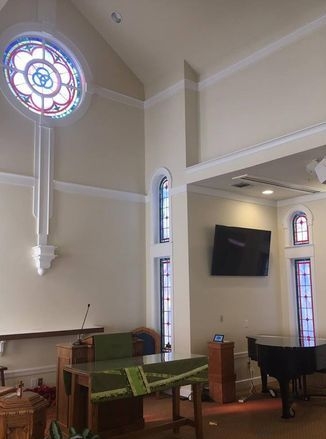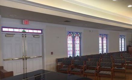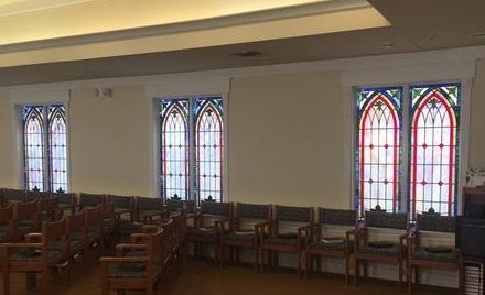 In 2005, Laws Stained Glass Studios installed (20) opalescent glass windows in the chapel at the Croasdaile Retirement Village in Durham, NC. The main sanctuary windows (size 52" wide x 72" high) did not contain hand-stained glass artwork, but were double windows. Near the pulpit, four windows (size 20" wide x 72" high), two windows (size 20" wide x 30" high with a round top), and two windows (size 20" wide x 54" high with a round top) are located. Behind the pulpit, a 5 foot round window with a symbol of the trinity is situated up high. Over the doors, there is a transom (size 72" wide x 12" high).