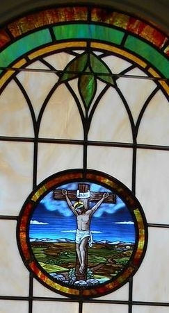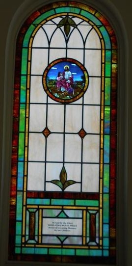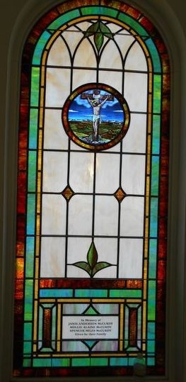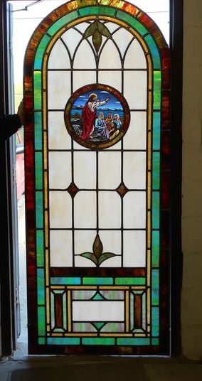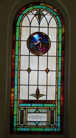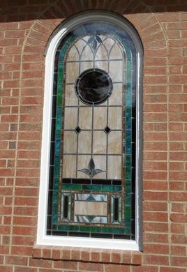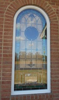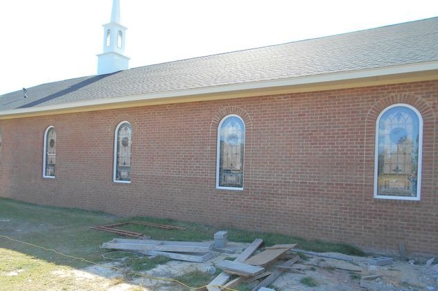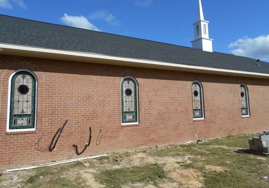 In 2015, Laws Stained Glass Studios installed 10 opalescent glass windows in the new sanctuary at Cornerstone Bible Church in Glennville, GA. Laws installed white aluminum frames into the brick opening. The leaded windows were set on the inside and on the outside, Laws installed 1/4" Lucite as the protective covering. Each window (size 36" wide x 84" high with a round top) has a 12" round Biblical scene from the "Life of Christ" series and a memorial plate at the bottom.