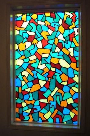 Close-up showing an opalescent glass window with 1/4" Lucite acrylic as the protective covering and the outside frame covered with white aluminum flashing