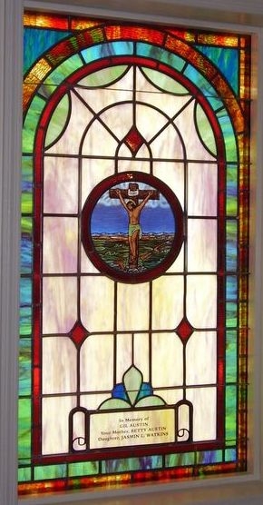 New opalescent glass window with a 12" round Biblical scene of the "Crucifixion" and a scroll memorial plate
