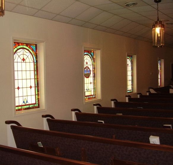 In 2010, Laws Stained Glass Studios installed (10) opalescent glass windows in the sanctuary at St. John CME Church in Glennville, GA. Six of the windows (size 36" wide x 60" high) had a 12" round Biblical scene from the "Life of Christ" series and a scroll memorial plate. Four of the windows (size 36" wide x 60" high) did not have artwork or a memorial plate.