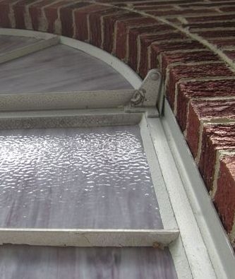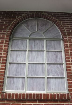 Opalescent glass window set into new dark bronze aluminum frames with 1" clear tempered glass. insulated glass units on the outside as the protective covering