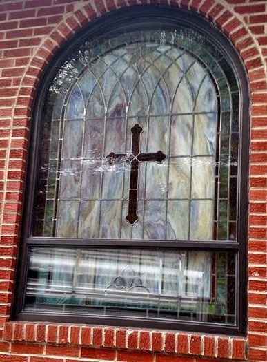 Opalescent glass windows with a cross set into new dark bronze aluminum frames