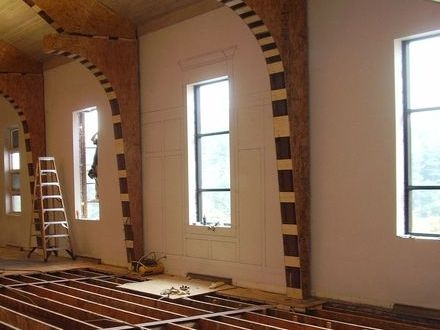 Laws Stained Glass Studios began by removing the existing metal windows and installing new dark bronze aluminum frames brick to brick. Inside the new frames, Laws installed 1" thick Insulated Glass Units. A few months later when the stained glass windows were ready and the contractor was finished on the interior. Laws returned and installed the new stained glass windows.