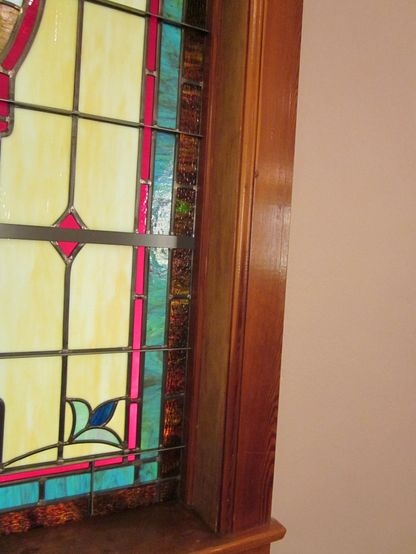 Opalescent glass window set into the existing wood frame that is flashed with 1/4" Lucite on the outside as the protective covering
