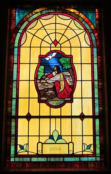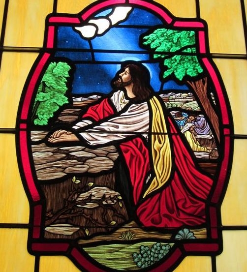 Close-up of the 18" x 26" hand-stained glass medallion of the "Garden of Gethsemane" scene