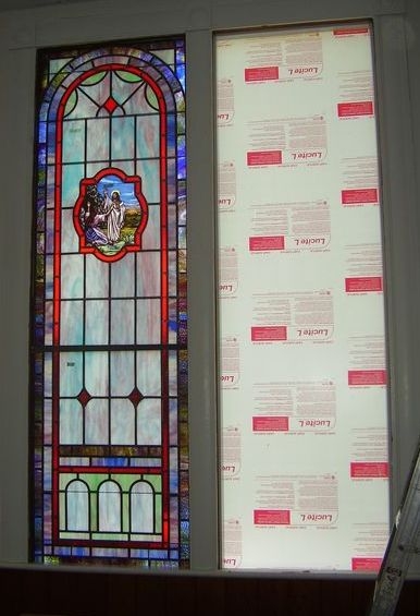 New opalescent glass window with 12" x 16" Biblical scene on the left, and on the right, the 1/4" Lucite acrylic is installed but the protective paper has not been removed yet