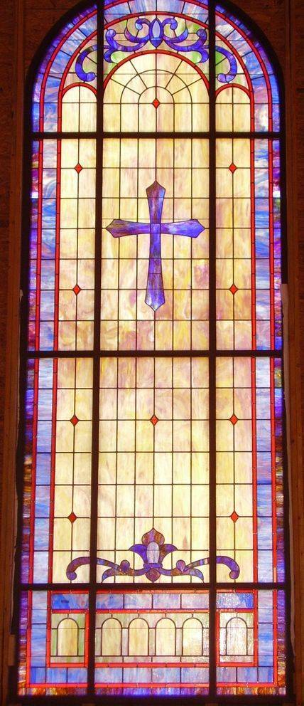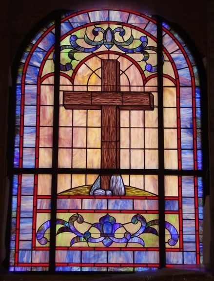 The opalescent glass window behind the pulpit with a hand-stained glass cross. It is installed into a dark bronze aluminum frame.