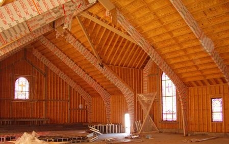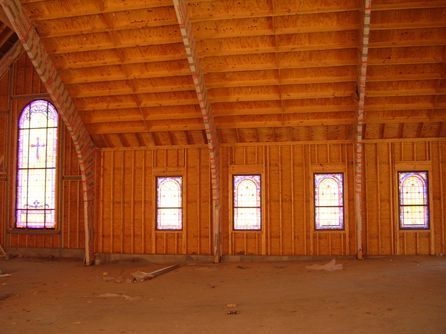 During construction, the opalescent glass windows have been installed with dark bronze aluminum frames.