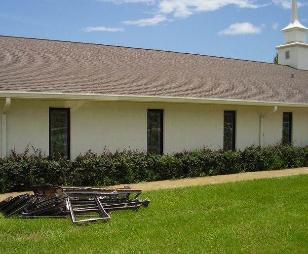 In 2010, Laws Stained Glass Studios installed 15 opalescent glass windows including new dark bronze aluminum frames, and 1/4" Lucite protective covering at Faith Baptist Church in Lake Placid, FL. The sanctuary windows (size 24" wide x 62" high) did not have any hand-stained artwork or a memorial plate. Laws removed the existing metal frames and installed the new aluminum frame into the masonry opening. On the inside of the frame, the leaded window was set and the 1/4" Lucite acrylic was installed on the outside.
