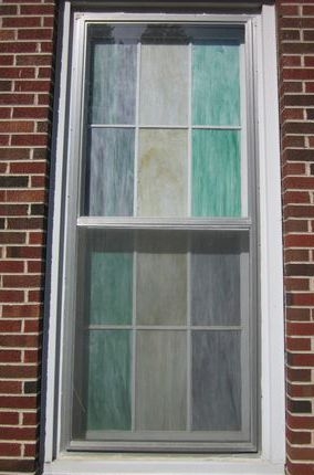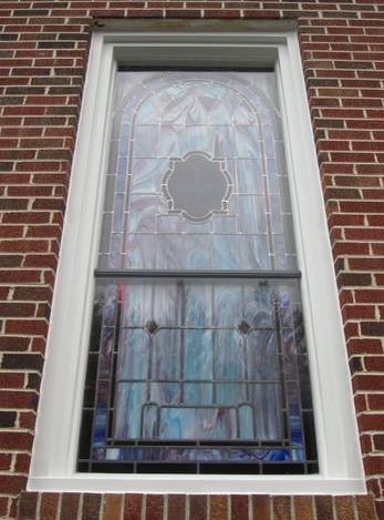 Opalescent glass window installed into the existing wood frame that is flashed on the outside and has 1/4" Lucite acrylic as the protective covering