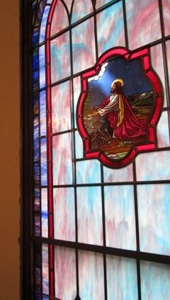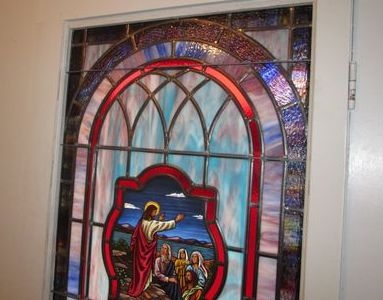 Opalescent glass window with "Sermon on the Mount" scene