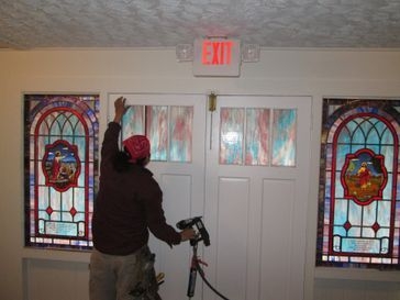 Opalescent glass windows with 12" x 16" medallions and memorial plate