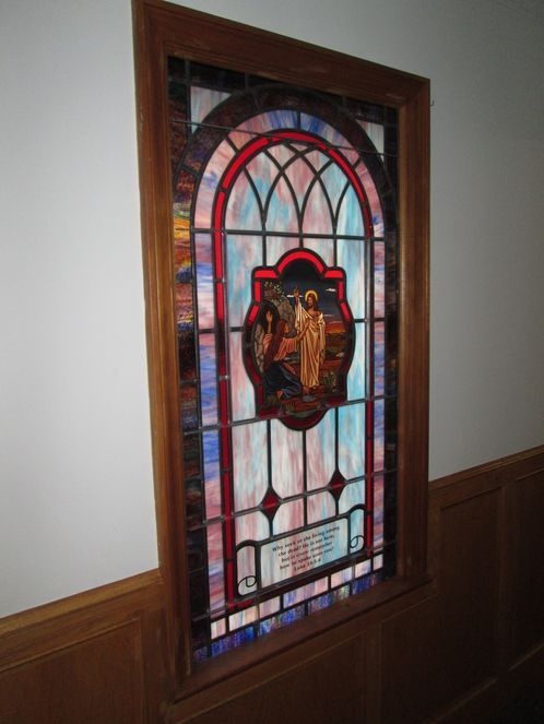 Opalescent glass window with 12" x 16" medallion of "The Resurrection" and a memorial plate