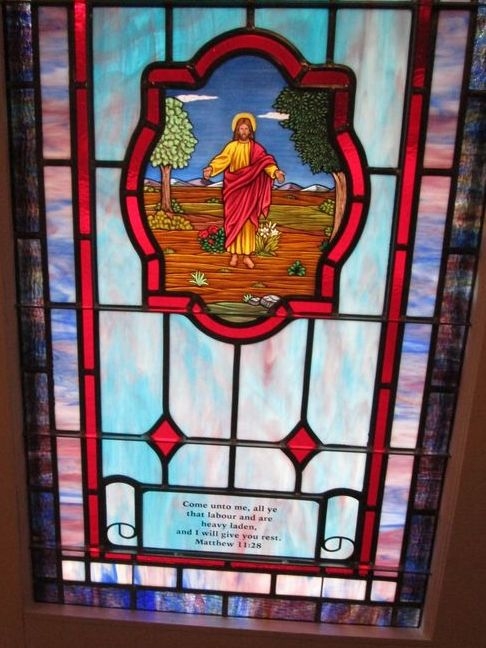Opalescent glass window with a 12" x 16" medallion Biblical scene and memorial plate
