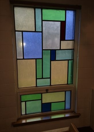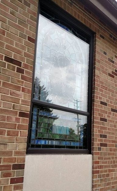 The windows are installed into the existing openings. Laws removed the existing frames from the brick openings and installed new dark bronze aluminum frames. On the inside, Laws set the new opalescent glass windows, and on the outside, new 1" Insulated Glass Units were installed as the protective covering.